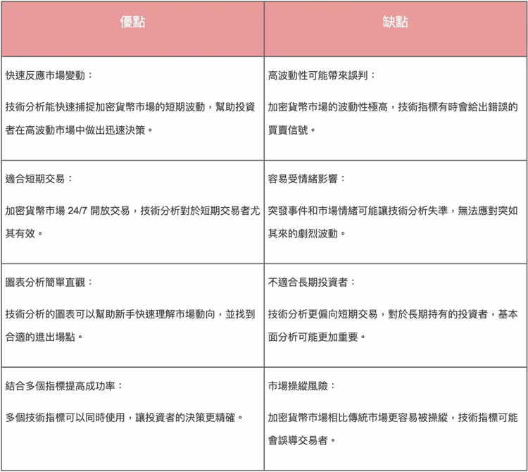技术分析与基本面分析没有哪一个是绝对万无一失,而因为技术分析关注在市场上,依然有他的几个短处,以下整理出技术分析的优缺表格,给新手投资者一览技术分析的优势和劣势。