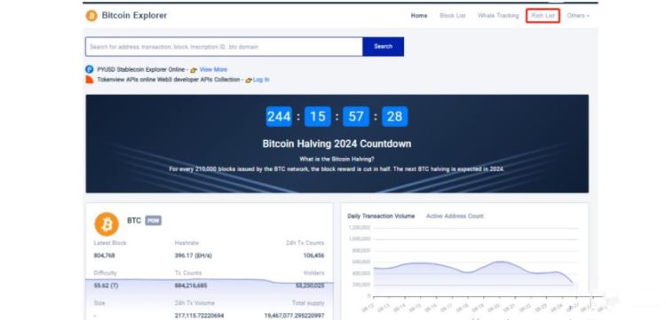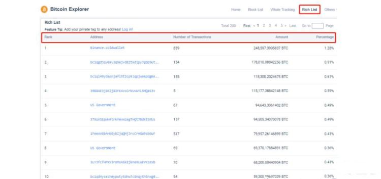 区块链浏览器是查询巨鲸地址的基础工具。以比特币为例,Blockchain.com、Blockchair、TokenView等均提供「富地址榜单」(Rich List)功能,可查看持有量排名靠前的钱包。例如,在TokenView中进入【Rich List】界面,即可获取各地址的持币数量、交易频次及占比,快速锁定潜在巨鲸。