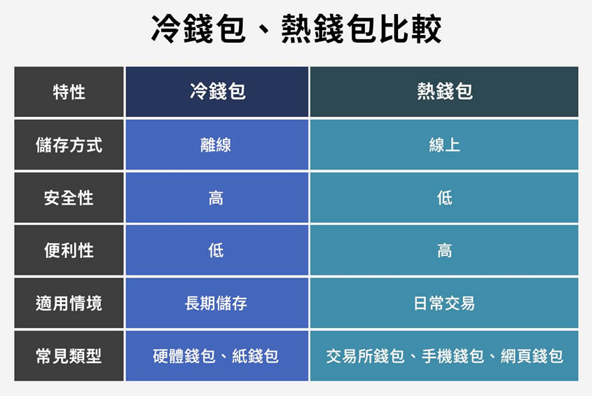 | 常见类型 | 硬件钱包、纸钱包、深度冷储存 | 交易所钱包、手机钱包、网页钱包 |