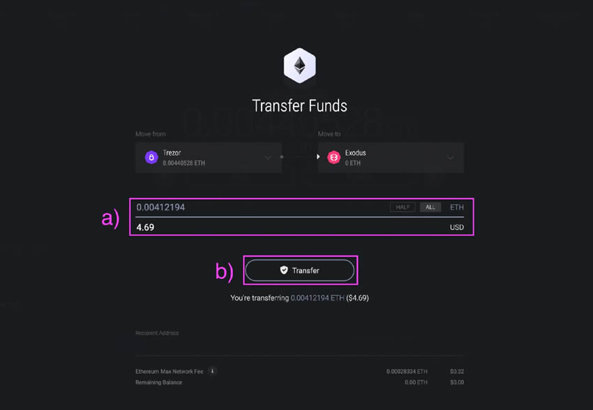 2. 下拉菜单中选择来源钱包(Exodus或Trezor),指定目标钱包。