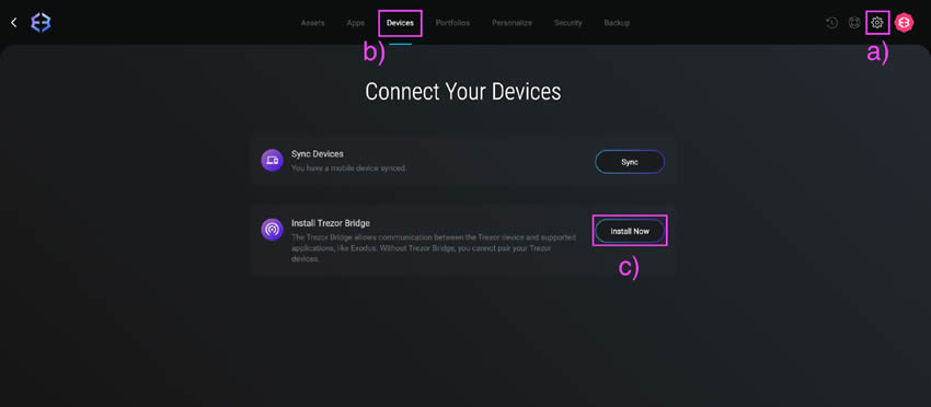 2. 在Exodus中进入“设置”→“设备”,点击“立即安装”以下载Trezor Bridge。
