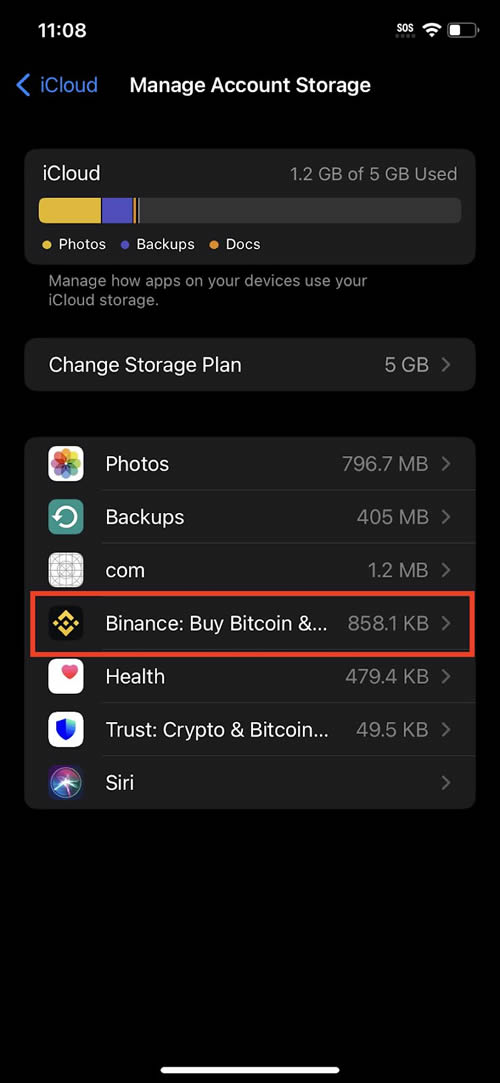 iOS用户可在iCloud中查看:【设置】→【iCloud】→【管理储存空间】→【币安】。