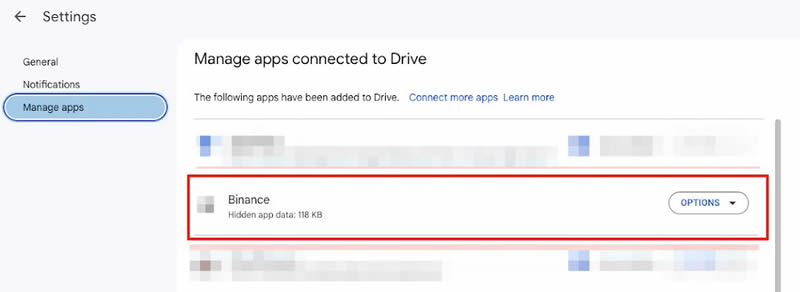 安卓用户可在Google Drive中查找:【设置】→【应用程序管理】→【Google Drive】→【币安】。