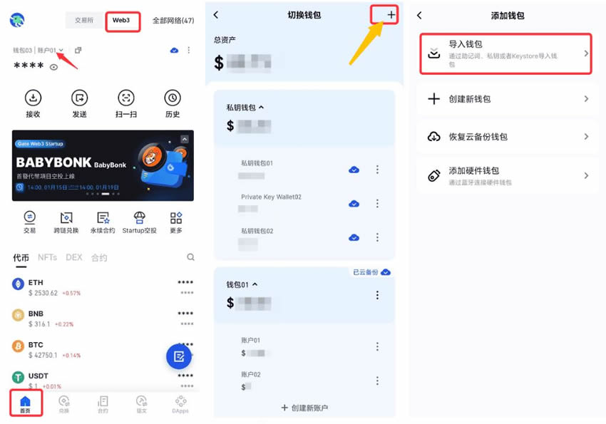 移动端:打开Gate.io App → 进入Web3首页 → 点击钱包名称 → 右上角+号 → 选择助记词或私钥导入。