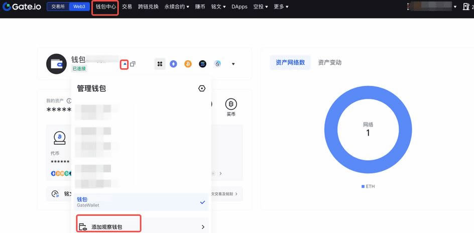 Web端:进入Gate Web3页面 → 钱包中心 → 左侧钱包列表点击▼下拉菜单 → 选择“添加观察钱包”即可导入。