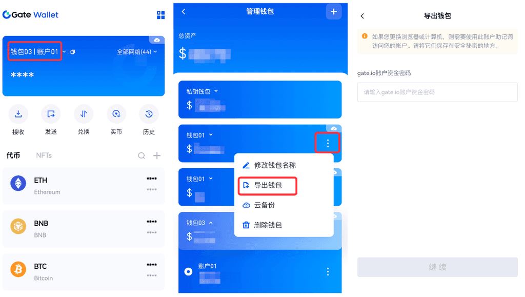 在钱包主页点击钱包名称 → 进入管理页面 → 点击右侧“导出钱包” → 输入资金密码后即可查看并备份助记词与私钥。