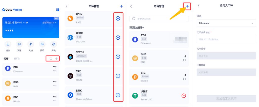 也可通过“币种管理”页面 → 点击右上角+号 → 手动输入合约地址及所属网络,完成自定义添加。