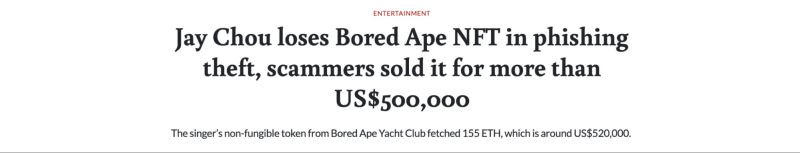 知名歌手周杰伦持有的价值约50万美元的Bored Ape Yacht Club NFT遭盗。据其透露,系点击钓鱼链接后授权恶意合约所致。该资产经多次转手,追踪困难。