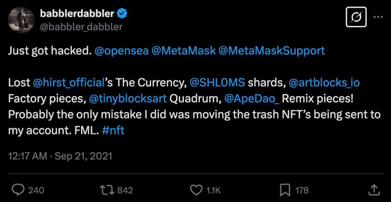 2021年9月,用户AJ在未核实来源的情况下,与钱包中突然出现的陌生NFT进行交互,导致13.75 ETH(约4.13万美元)被清空。唯一失误即为一次非主动操作。
