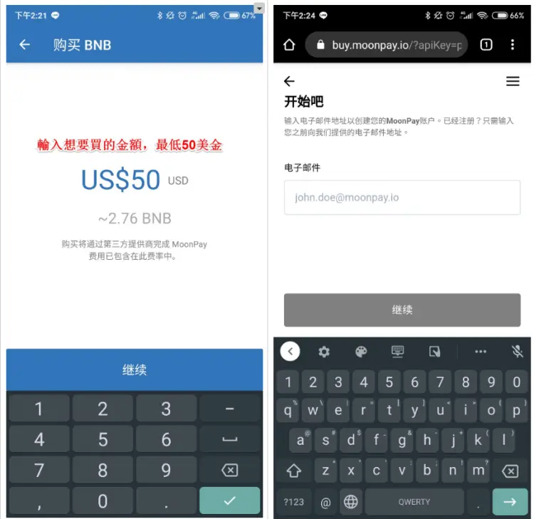 系统将跳转至MoonPay平台。该平台为币安合作的国际支付服务商,支持信用卡/借记卡购买加密货币。