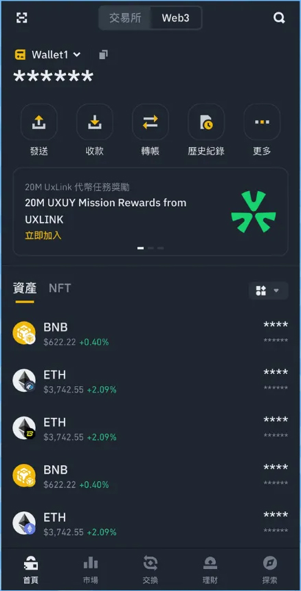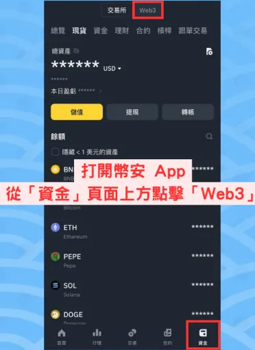打开币安App,从「资金」板块顶部点击「Web3」按钮,进入专属界面。