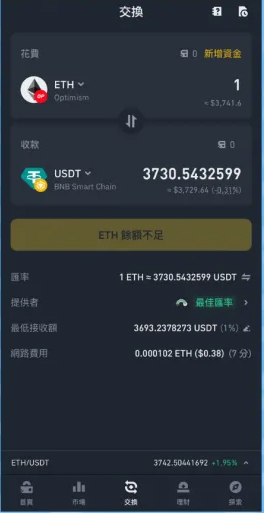 集成多个去中心化交易所(DEX)与跨链桥协议,系统自动比价并推荐最优路径。例如将Optimism链上的ETH兑换为BNB Smart Chain上的USDT时,会自动识别可用桥接方案并显示手续费明细,提升交易效率。