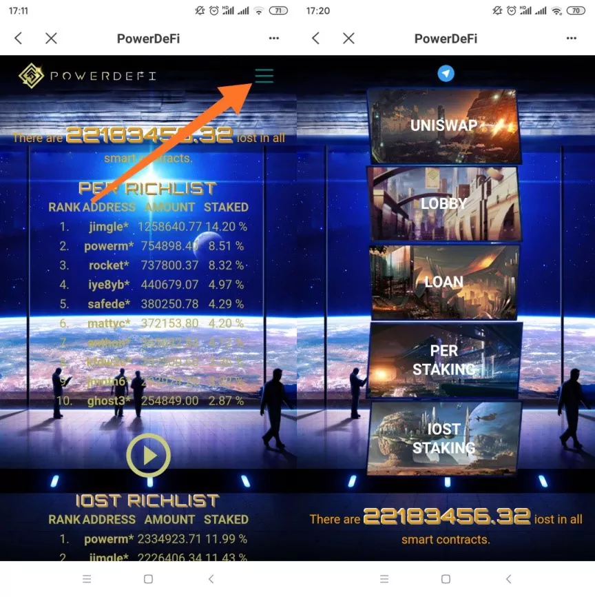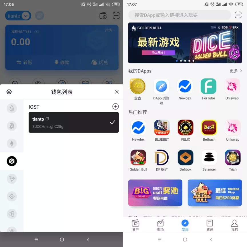 打开TokenPocket钱包,切换至IOST底层网络,点击【发现】进入应用市场。在顶部搜索栏输入“PowerDeFi”,点击对应应用图标进入主界面。