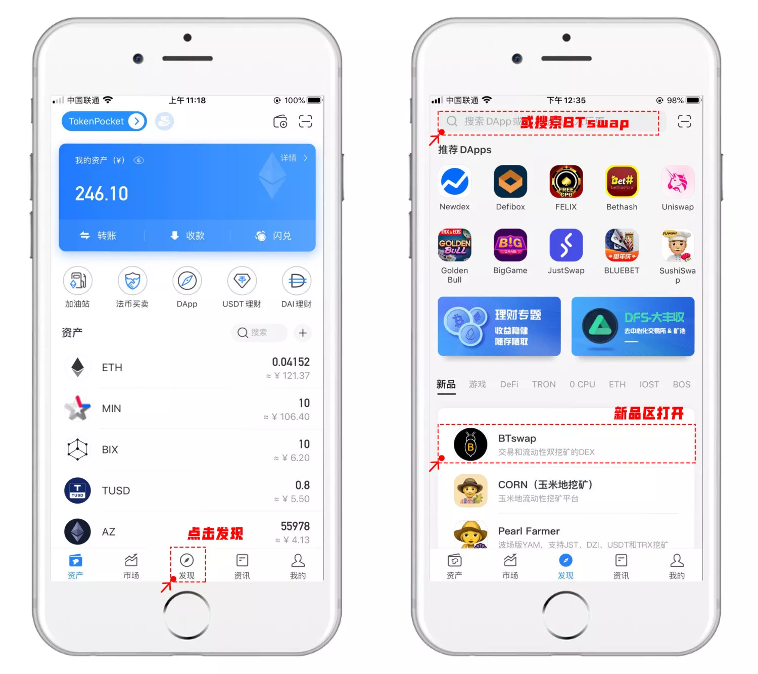 打开TP钱包,点击底部【发现】菜单进入【新品区】,或通过顶部搜索栏输入“BTswap”直接打开应用。