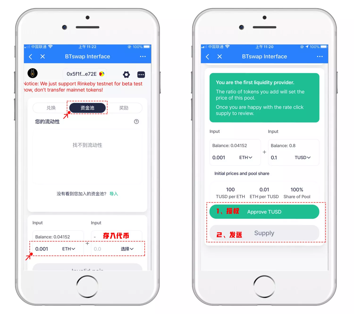 进入【资金池】页面,选择希望提供流动性的代币对,设置存入金额后,系统提示【Approve TUSD】授权。完成授权后点击【Supply】,即可将资产注入资金池,参与做市并获取交易手续费收益。