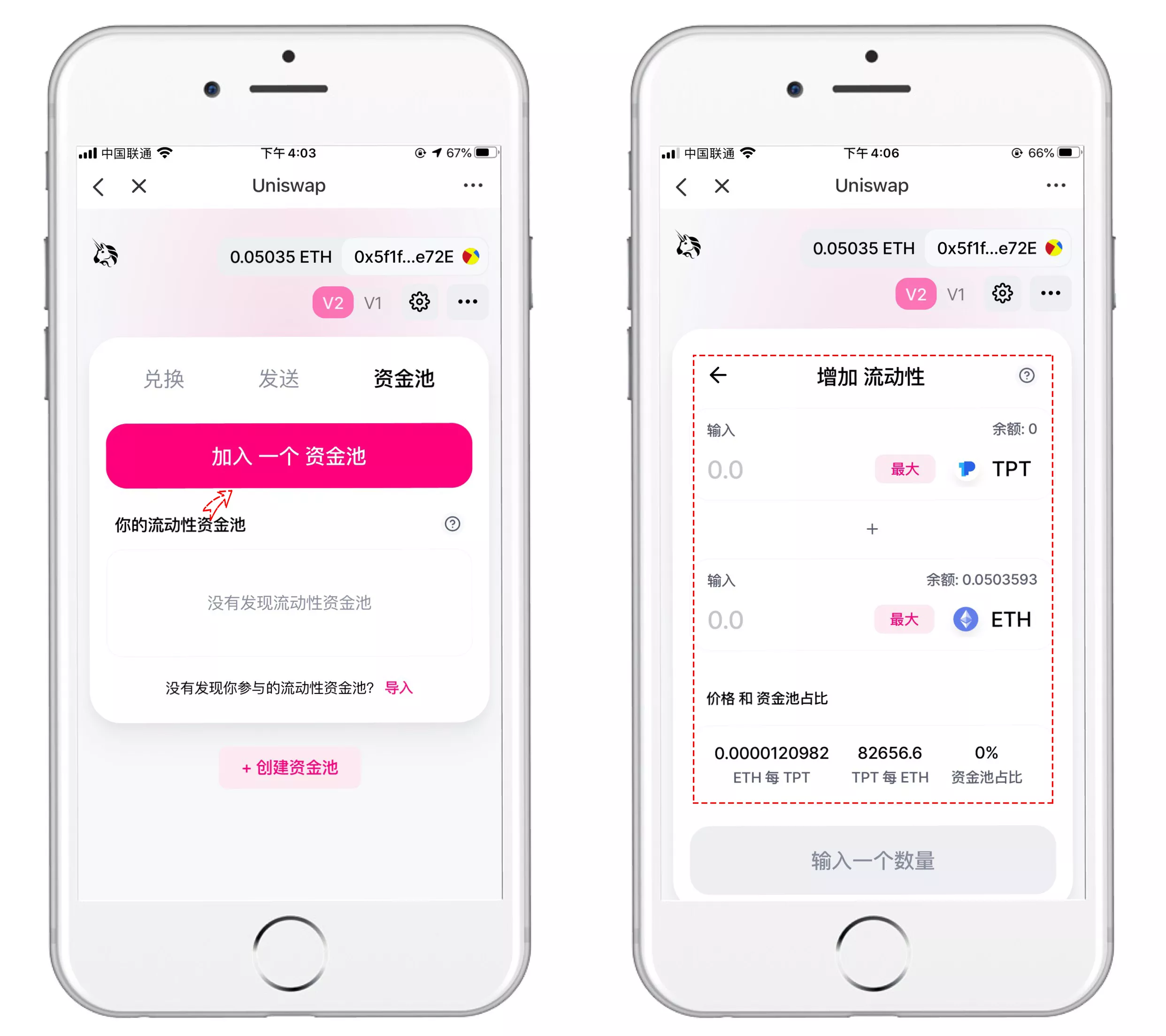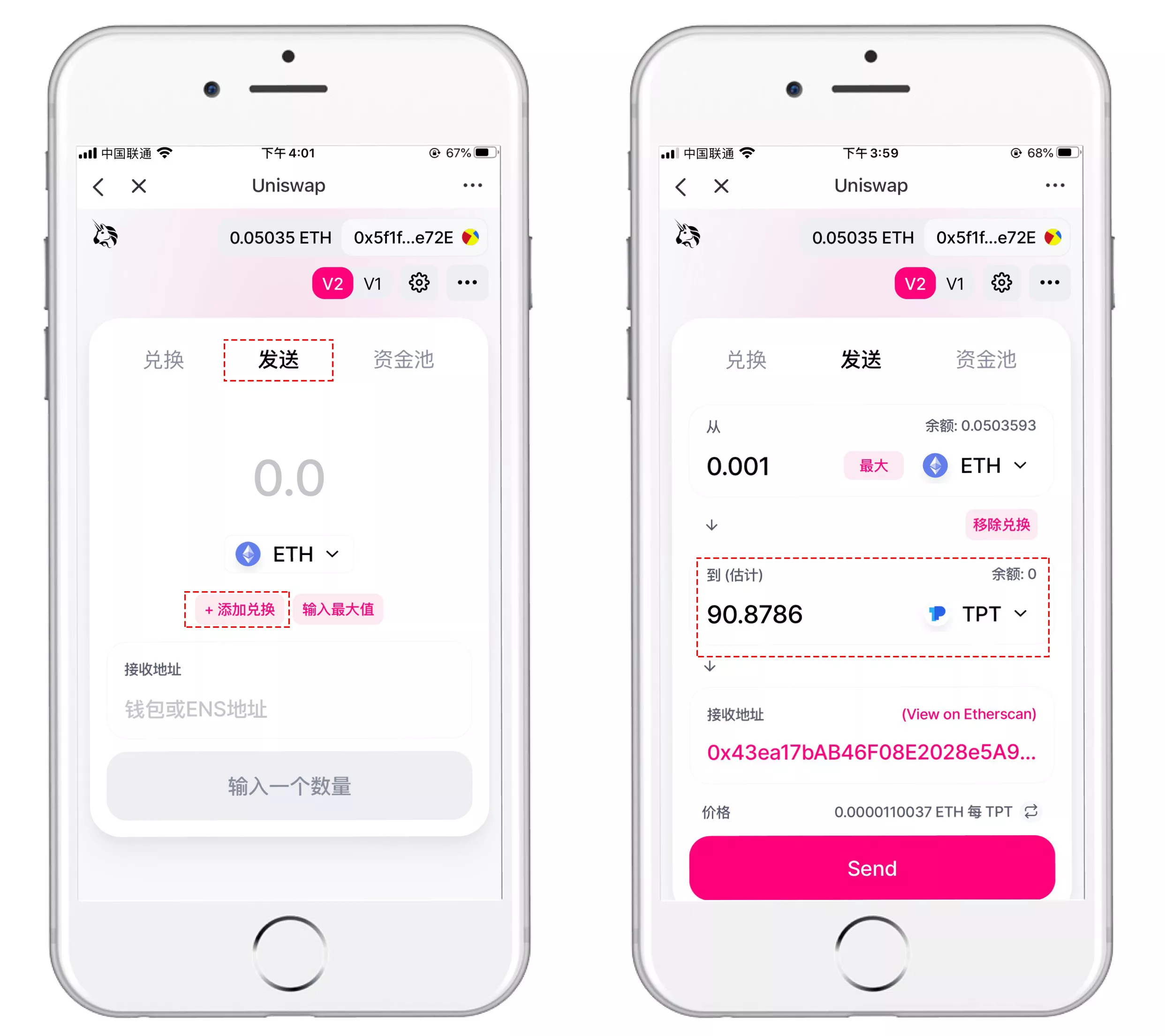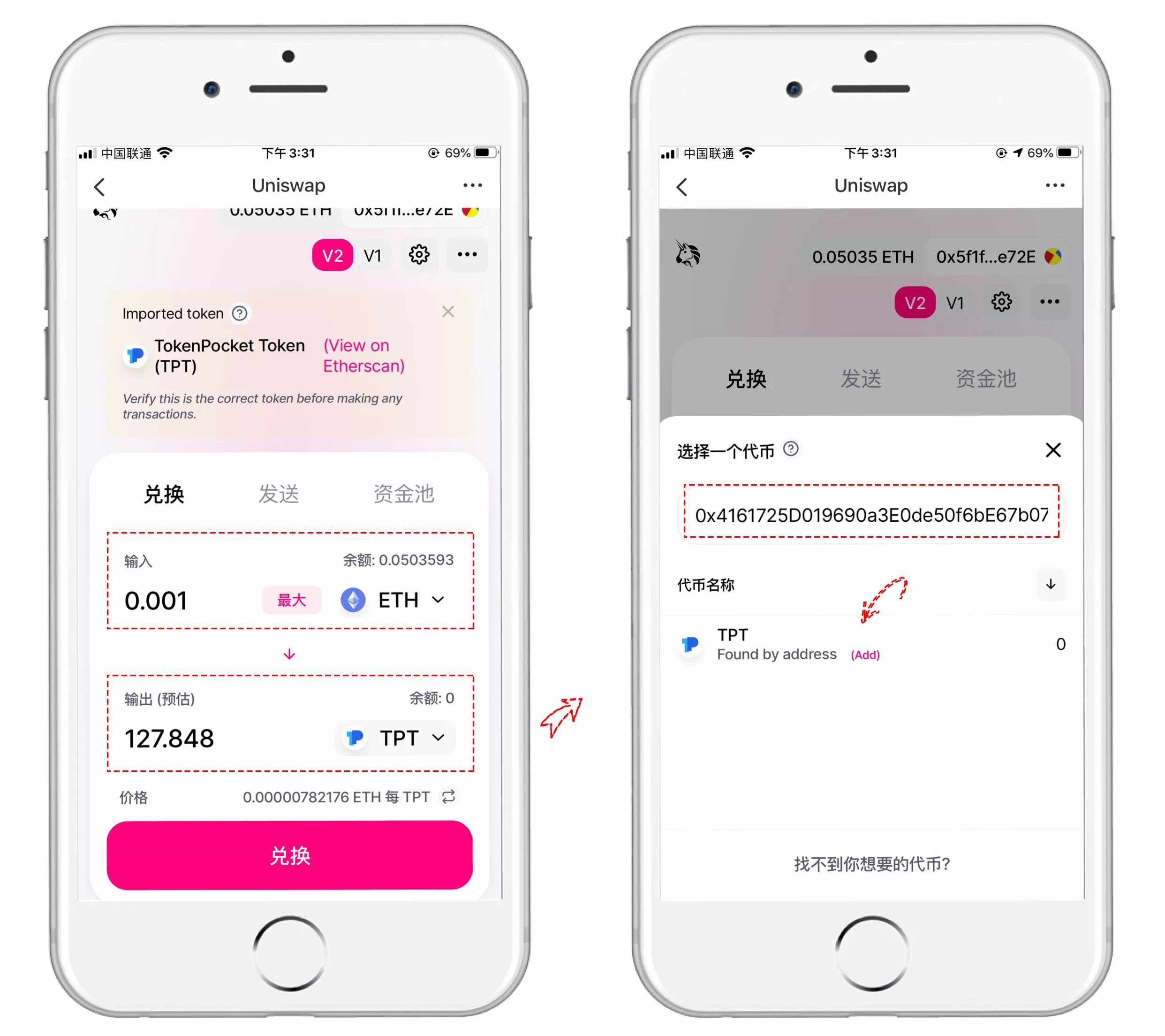 二、Uniswap主界面分为【兑换】【发送】【资金池】三大模块。默认展示【兑换】界面,可选择输入币种(如ETH)与输出币种。当前苹果移动端需手动输入合约地址添加TPT代币:0x4161725d019690a3e0de50f6be67b07a86a9fae1。