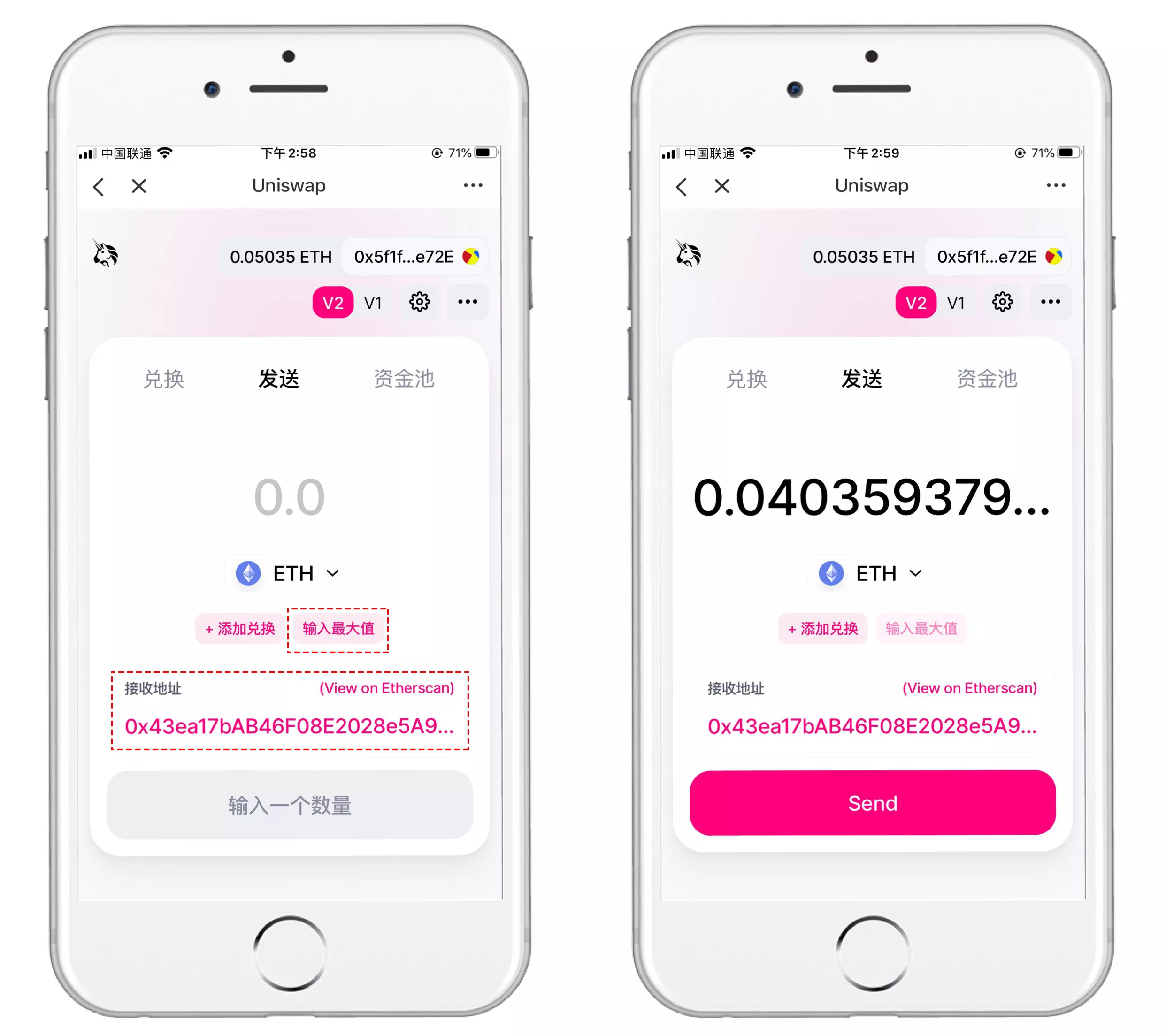 四、【发送】功能支持代币转账,也可实现“兑换+发送”一体化操作。输入金额后可选【输入最大值】自动预留Gas,确保剩余代币顺利到账。正确填写接收地址后点击【Send】即可完成。