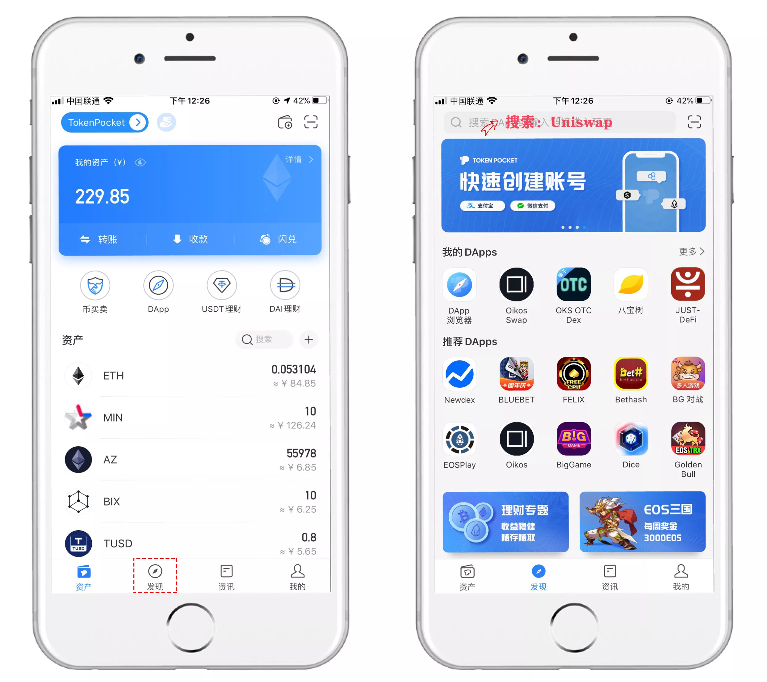 一、打开TP钱包,进入【发现】页面,顶部搜索栏输入“Uniswap”,选择任意版本(v1或v2)进入。